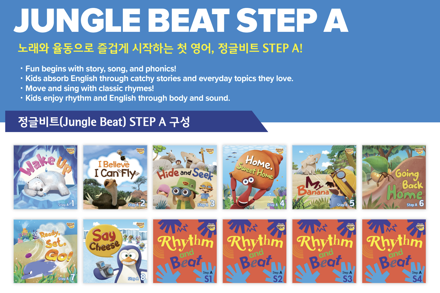 정글비트 STEP A는 공부가 아니라 즐거운 놀이처럼 영어를 시작할 수 있게 도와줍니다.